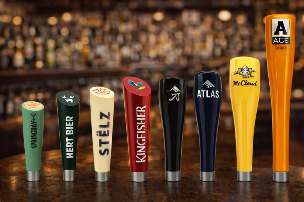 Custom tap handles available in different materials, colors, sizes, and printed designs, engineered for durability, ergonomics, and seamless system integration.